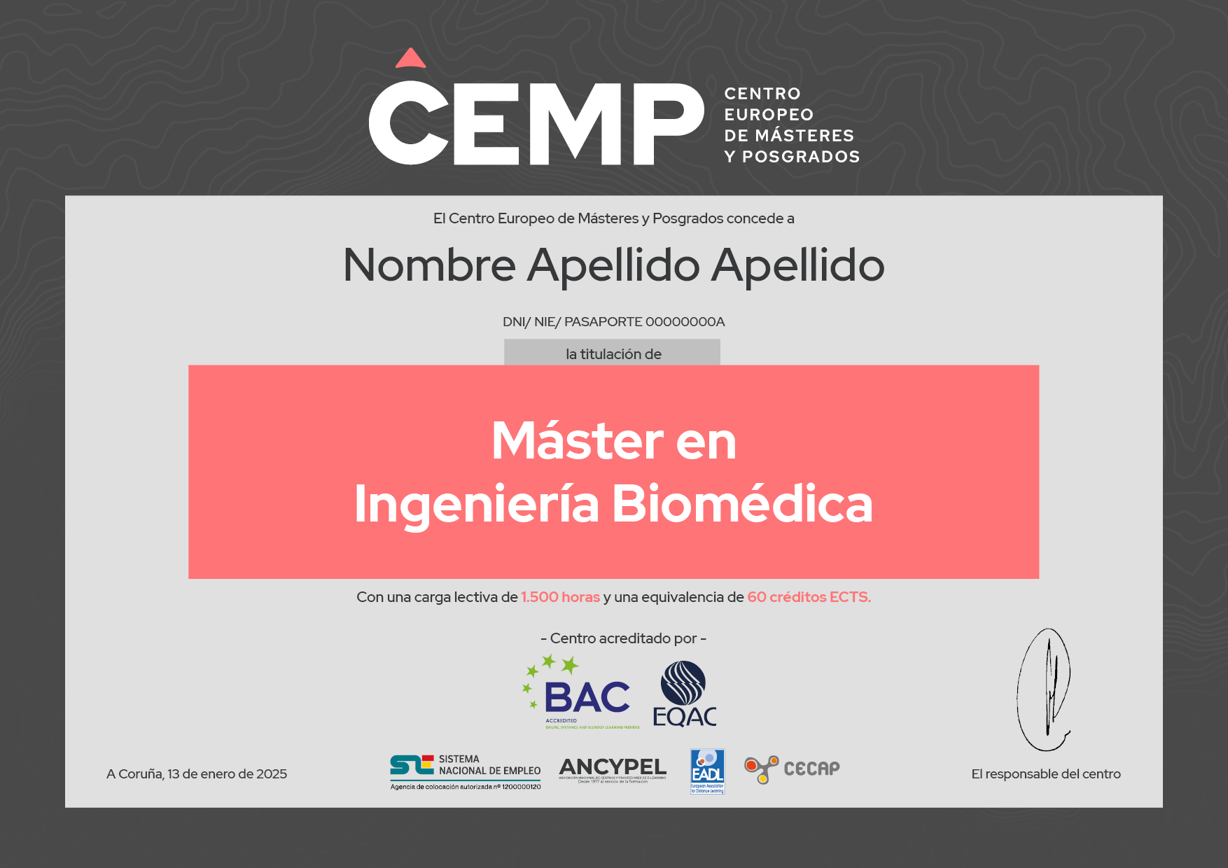 El futuro de la investigación médica pasa por la biomedicina, un campo que ya está revolucionando el modo que tenemos de prevenir, diagnosticar y tratar lesiones y enfermedades. Nuestro Máster en Ingeniería Biomédica te preparará para construir una carrera profesional en este apasionante sector al proporcionarte una visión integral del desarrollo, aplicación y gestión de tecnologías médicas.